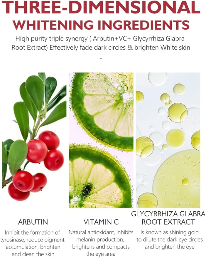 nWaxa kale oo ku jira walxo caddeyn ah (whitening / brightening) sida arbutin, Vitamin C, iyo Glycyrrhiza Glabra (licorice root extract) si loo yareeyo midab madow, loo iftiimiyo maqaarka hoosta indhaha.